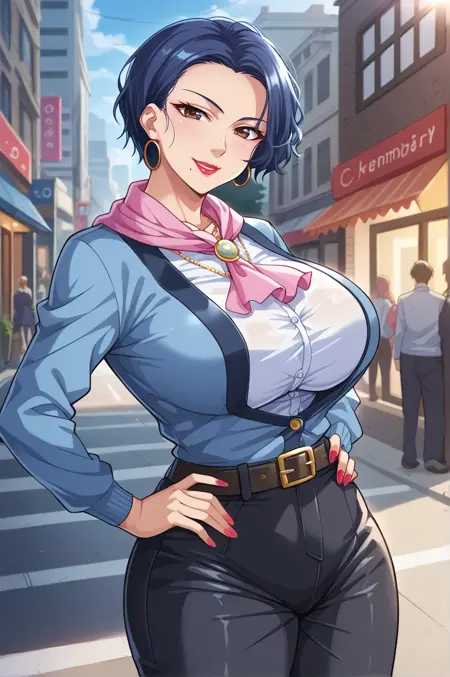 blue hair, short hair, brown eyes, huge breasts, mole under mouth, lipstick, red lips, hoop earringsAttire