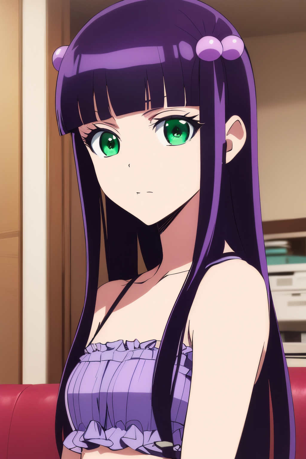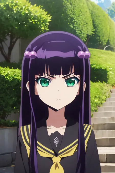 Appearance: Benio Adashino, long hair, purple hair, blunt bangs, green eyes, hair ornament, hair bobbles,