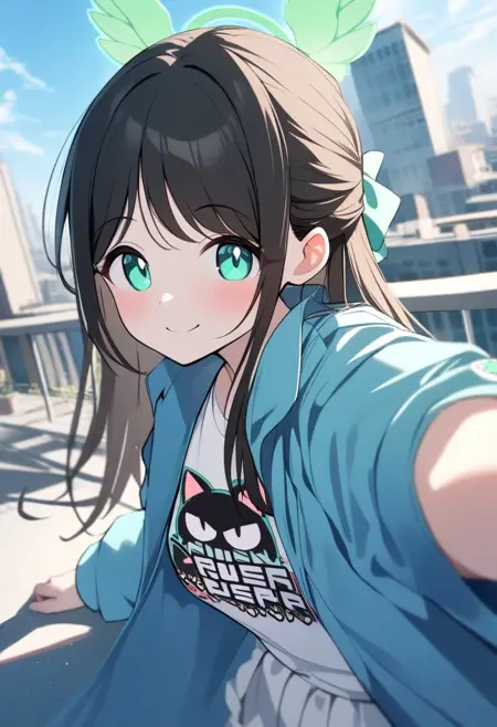 airi (band) (blue archive), blue coat, white shirt, print shirt