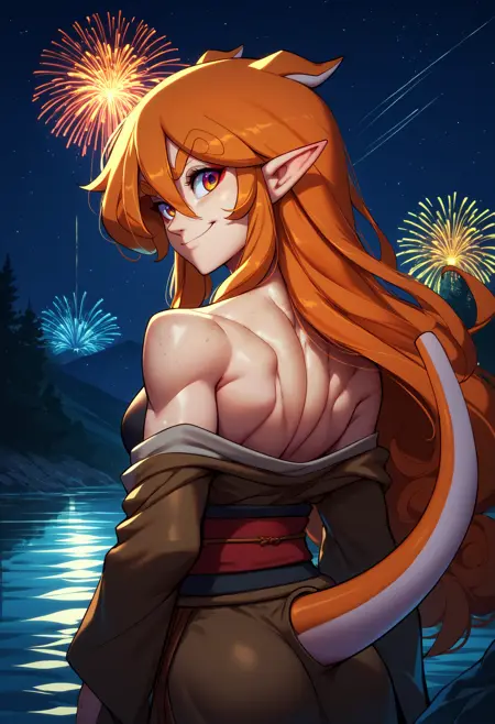 Trigger: "wonhan, freckles, multicolored eyes, pointy ears, animal ears, lizard tail, orange hair, hair between eyes, long hair" always needed.