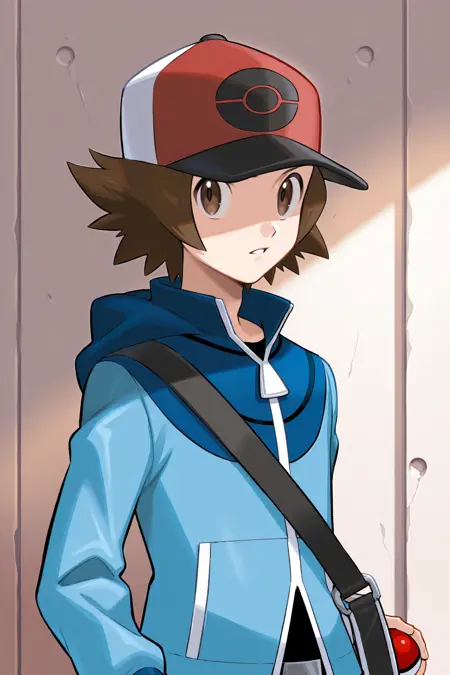 Normal outfit: red with white baseball cap, blue hooded jacket, black shirt, black pants, red shoes