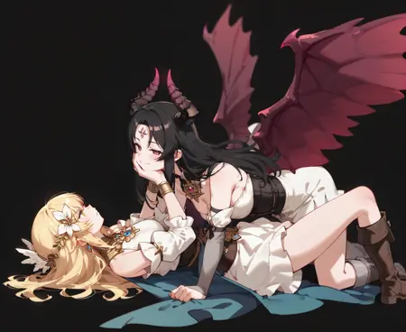 1girl, demon horns, demon wings, demon girl, medium breast, strapless, elbow gloves,