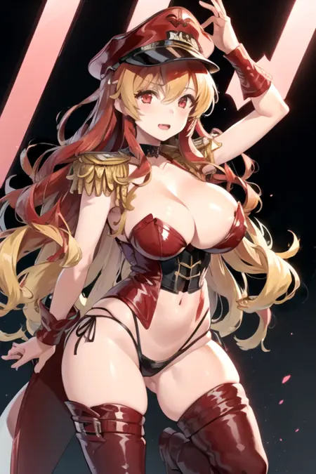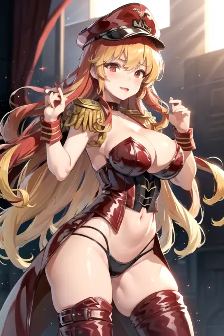 | 학습된 단어 | FlamingBelial, 1girl, solo, very long hair, two-tone hair, blonde hair, red hair, large breasts, red eyes, red thighhighs, navel, cleavage, black panties, choker, wrist cuffs, wavy hair, peaked cap, red headwear, corset, epaulettes, highleg panties, bustier복사됨! |