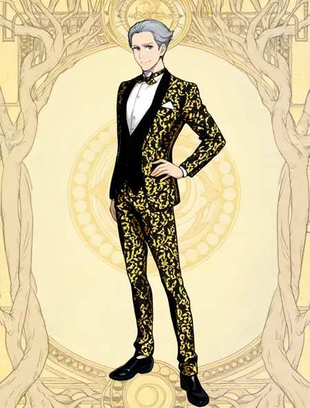 yellow pants, yellow jacket, pattern, vest, neckbow, white shirt