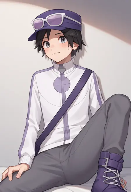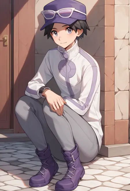 엑스 컬러: calem_pokemon, 검은 머리, 회색 눈, 보라색 모자, 안경이 모자에 착용, 흰색에 보라색 재킷, 회색 바지, 보라색 부츠,