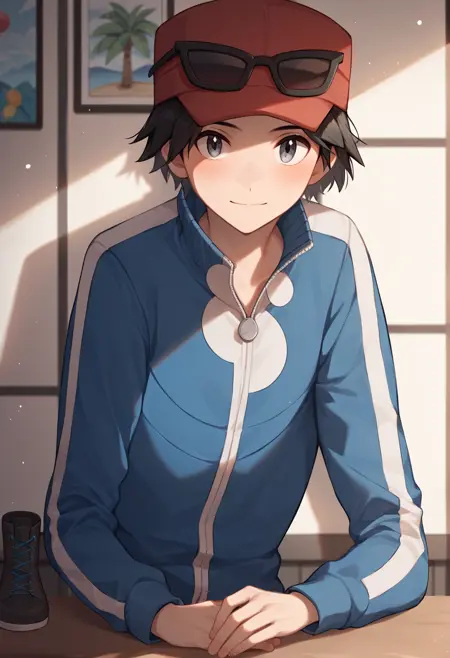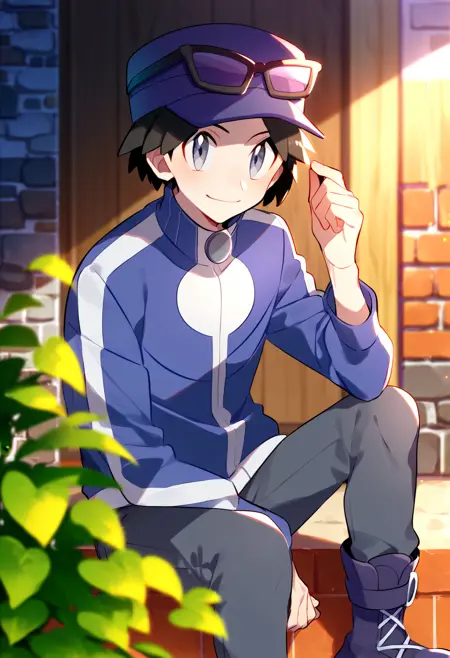 일반 복장: calem_pokemon, 검은 머리, 회색 눈, 빨간 모자, 안경이 모자에 착용, 파란 재킷, 파란 바지, 검은 부츠,