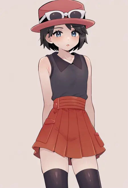 세레나 복장: calem_serena, 1boy, 검은 머리, 회색 눈, 빨간 모자, 팔찌, 검은 민소매 셔츠, 빨간 치마, 검은 허벅지 긴 양말, 안경이 모자에 착용, 부츠,
