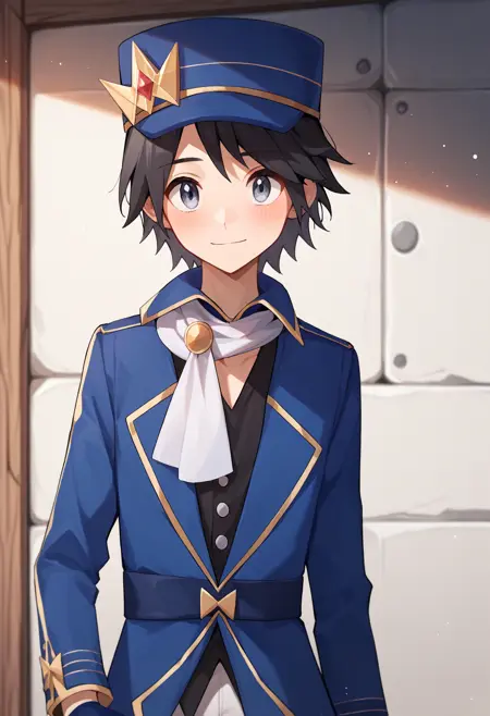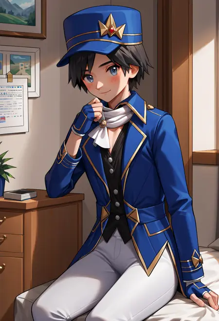엑스 컬러: calem_champ, 검은 머리, 회색 눈, 파란 모자, 파란 재킷, 흰색 바지, 흰색 부츠, 파란 지글리 글러브, 흰색 스카프, 검은 셔츠,