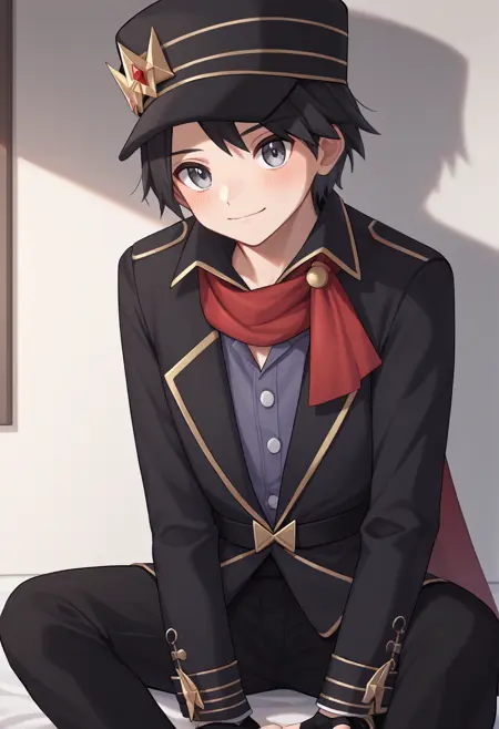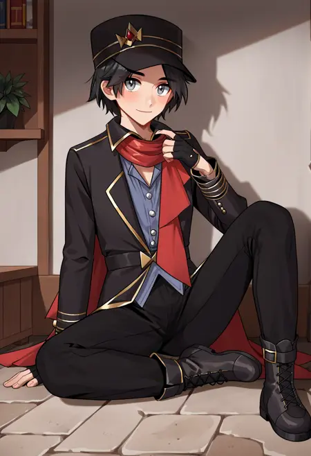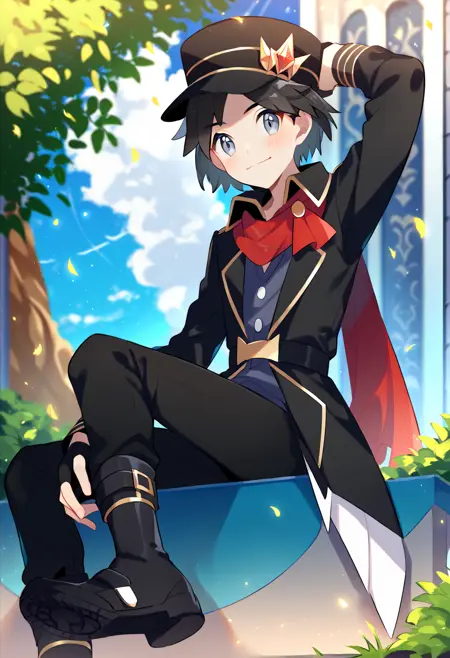 Neo 챔피언 복장: calem_champ, 검은 머리, 회색 눈, 검은 모자, 검은 재킷, 검은 바지, 검은 부츠, 검은 지글리 글러브, 빨간 스카프, 회색 셔츠