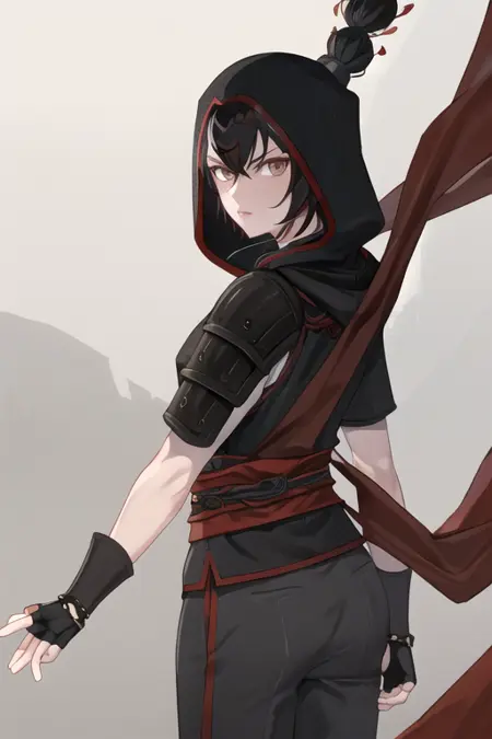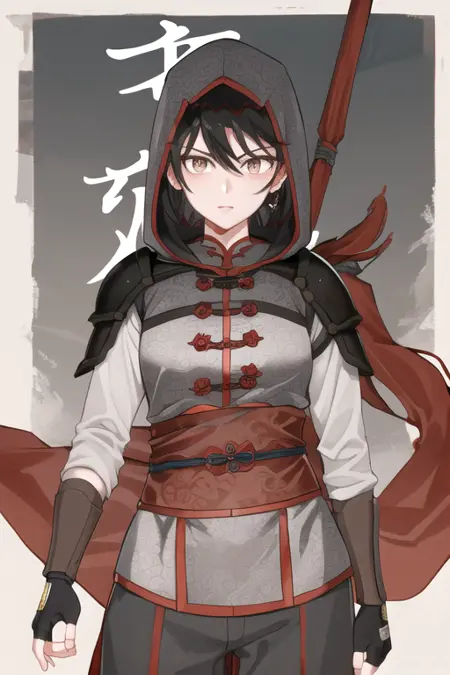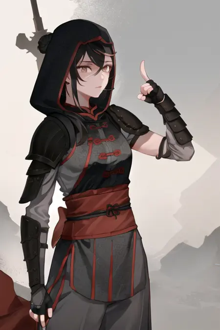 ShaoJun, 1girl, solo, short hair, black hair, black gloves, brown eyes, jewelry, pants, hood up, fingerless gloves, necklace, armor, sash, chinese clothes, shoulder armor, pauldrons