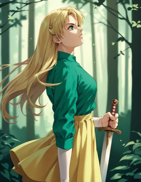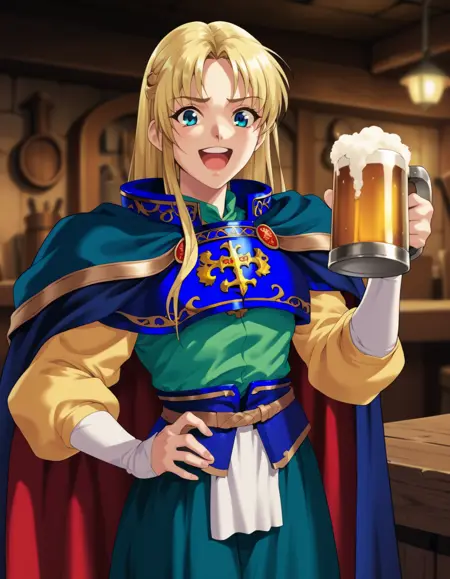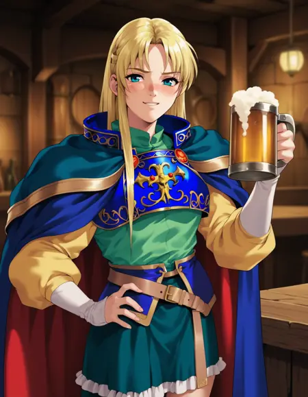 胸甲、蓝色斗篷、红色斗篷、双面斗篷、绿色上衣、黄色袖子、绿色裙子绿色裙子、黄色上衣黑色斗篷、红色斗篷、双面斗篷、绿色上衣、黄色裙子、肘部手套、过膝袜绿色上衣、黄色裙子