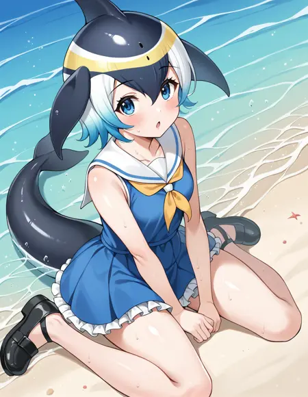 触发词:普通瓶鼻海豚 \(kemono friends\), 1girl, 蓝色眼睛, 头部鳍, 多色头发, 白色头发, 短发, 鲸类尾巴