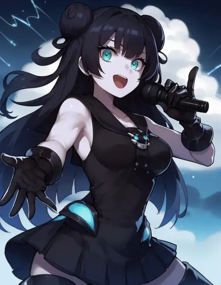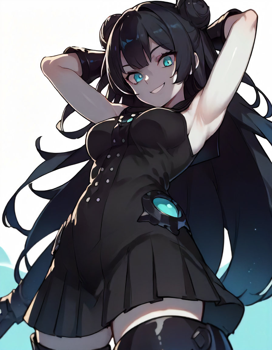 薄い肌、長い髪、黒髪、二つの束ね髪、アクア色の目、