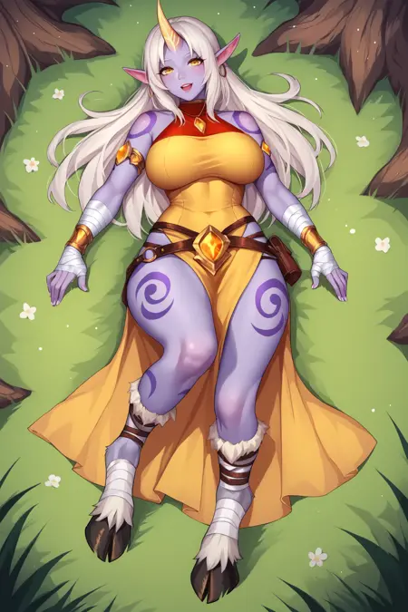 ➜ SorakaLoLXLv2, 紫色の肌, 色付きの肌, 紫色の体, 白髪, 長髪, 低く結んだ長髪, 鬓, 黄色い目, 尖った耳, 単一の角, タトゥー, 大きな胸, 肩出し, 黄色い宝石, 赤い短めの上着, 黄色いドレス, 腕輪, 包帯を巻いた腕, ベルト, 包帯を巻いた足, 山羊の蹄