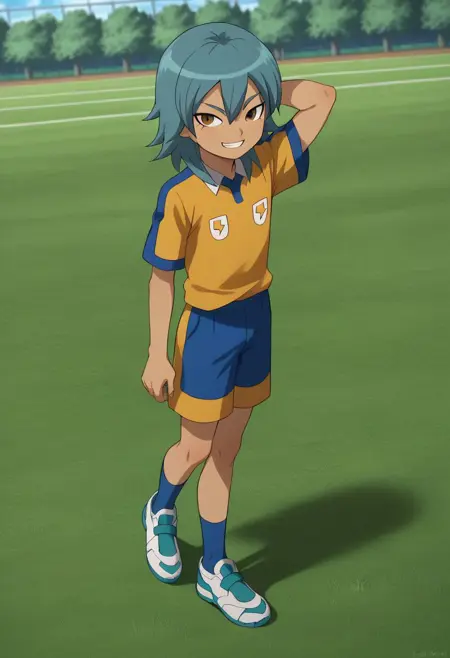 카리야마사키, 1소년, 남성 중심, 단독, 갈색 눈, 청록색 머리카락, 눈 사이의 머리카락, 라이몬 축구 유니폼, 셔츠, 노란색 셔츠, 단기 sleeves, 번개 문양, 반바지, 파란색 반바지, 양말, 파란색 양말, 신발, 스니커즈,