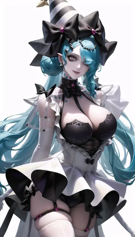 无期迷途-娜恰-light blue hair,hair over one eye,smile, outfit-frilled dress, white thighhighs, party hat.safetensors