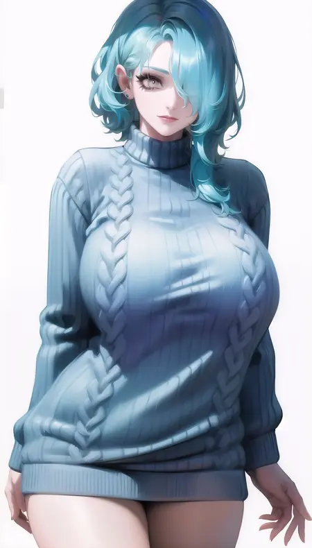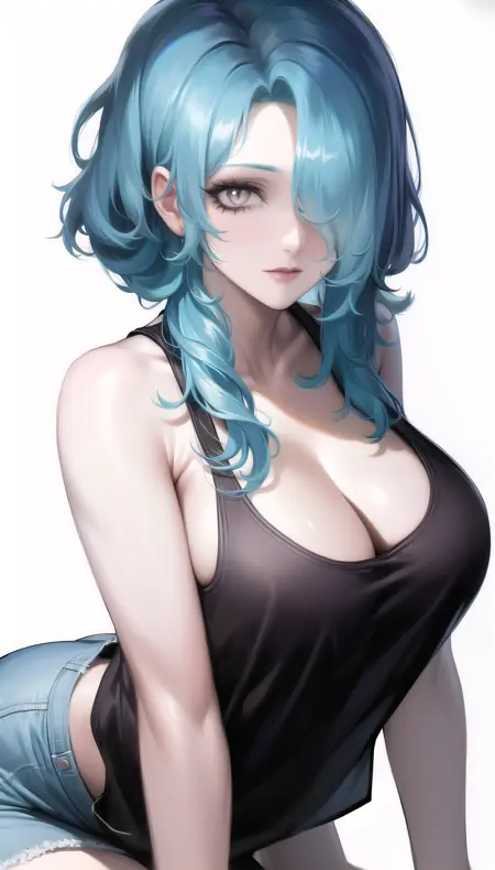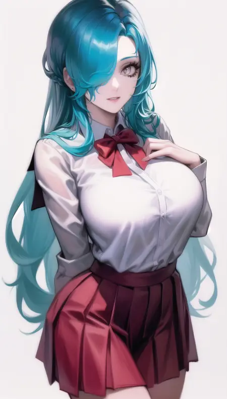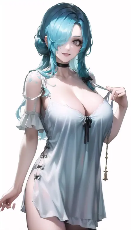 light blue hair,hair over one eye,smile,