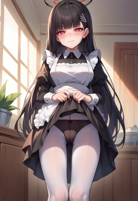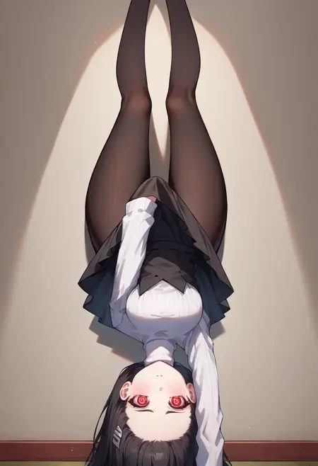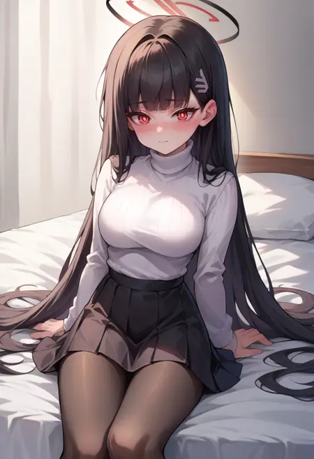 RioBase, 黑发, 红眼, 环形瞳孔, 白色瞳仁, 发夹, 光环, 白色高领毛衣, 黑色短裙, 黑色连裤袜