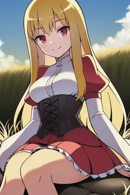 Recommended prompt: Claudia, Red eyes, Blond long hair, Red dress, Red Puffy Sleeves, White Shirt, White Long Skirt, Brown Leather Corset