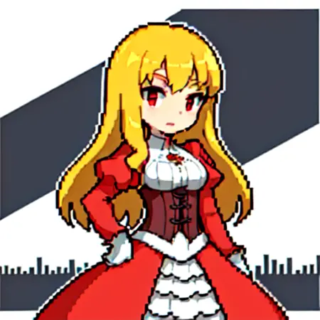 推奨プロンプト:Claudia、赤い目、金髪、赤いドレス、赤いボリュームスリーブ、白いシャツ、白い長めのスカート、コルセット