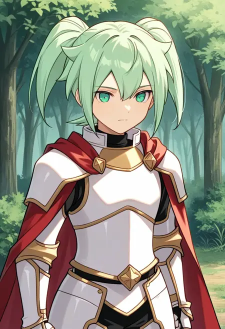 feirun, 1boy, male focus, solo, green eyes, green hair, twintails, hair between eyes, shirt, black shirt, armor, white and gold armor, cape, red cape
