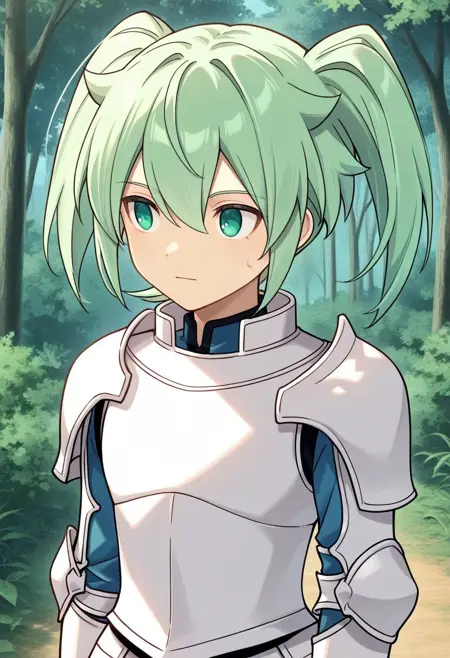 feirun, 1boy, male focus, solo, green eyes, green hair, twintails, hair between eyes, shirt, blue shirt, armor, white armor,