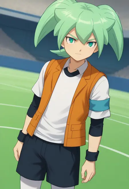 feirun, 1boy, male focus, solo, green eyes, green hair, twintails, hair between eyes, garu soccer uniform, shirt, white shirt, black shirt, long over short sleeves, vest, orange vest, shorts, black shorts, pantyhose, white pantyhose, shoes, black footwear, armband