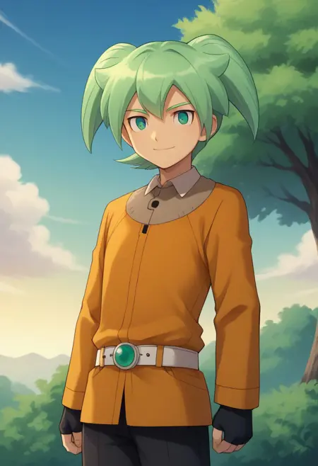 feirun, 1boy, male focus, solo, green eyes, green hair, twintails, hair between eyes, jacket, orange jacket, long sleeves, gloves, black gloves, fingerless gloves, belt, pants, black pants, shoes, white footwear,