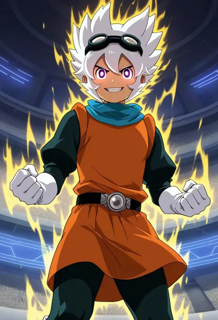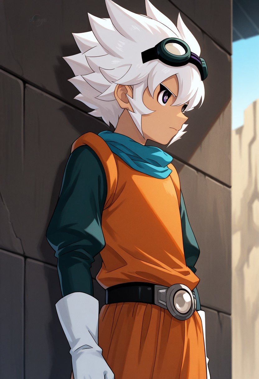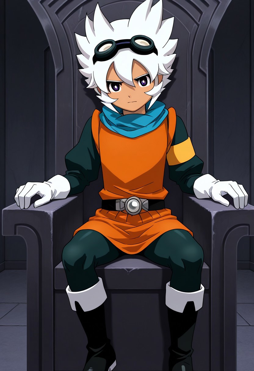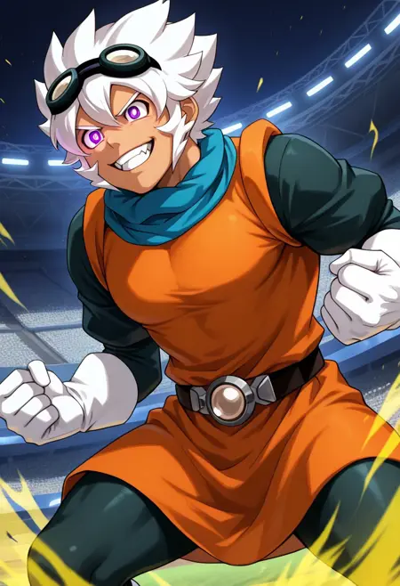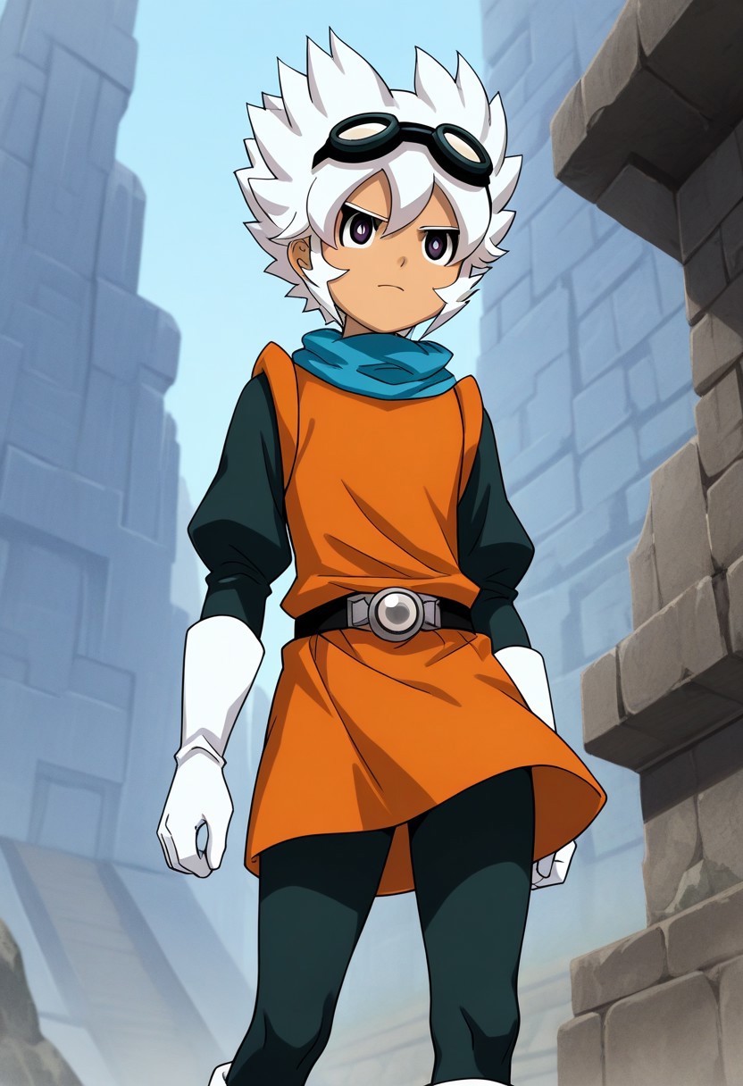 simeon_ina, 1boy, male focus, solo, purple eyes, white hair, goggles, goggles on head, lagoon soccer uniform, tunic, orange tunic, belt, bodysuit under clothes, black bodysuit, armband, gloves, white gloves, boots, black footwear,