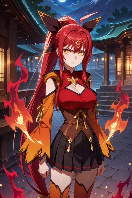 복장: 빨간 드레스, 가슴 노출 디자인, 미니스커트, 검은 스커트, 오렌지색 허벅지 양말, 주름진 스커트, 분리된 소매, 넓은 소매, 원형 헤어밴드, 갈색 언더버스트, 갈색 신발, 앵클 부츠