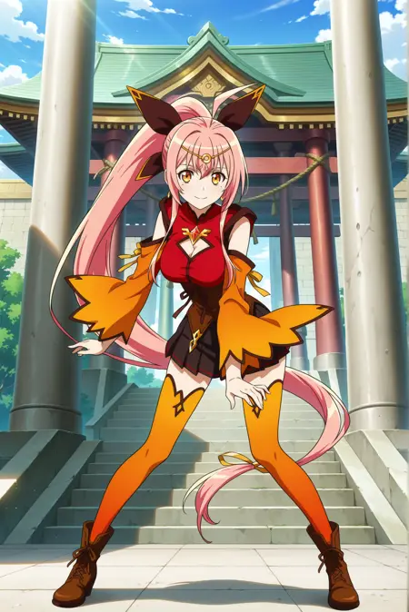 복장: 머리 리본, 빨간 드레스, 가슴 노출 디자인, 미니스커트, 검은 스커트, 오렌지색 허벅지 양말, 주름진 스커트, 분리된 소매, 넓은 소매, 오렌지색 소매, 원형 헤어밴드, 갈색 언더버스트, 갈색 신발, 앵클 부츠