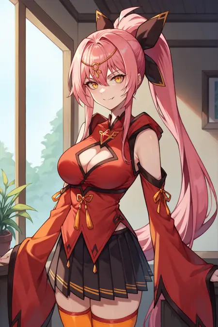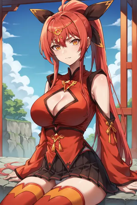 服装: 发带,红色连衣裙,露胸剪裁,迷你裙,黑色短裙,橙色过膝袜,百褶裙, detach sleeves,宽袖,橙色袖子,头环,棕色胸衣,棕色鞋履,短靴
