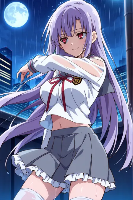 デフォルトの衣装: セーラー服、学校制服、ミニスカート、タイツ、お腹、へそ、フリル付きスカート、グレーのスカート、白いシャツ