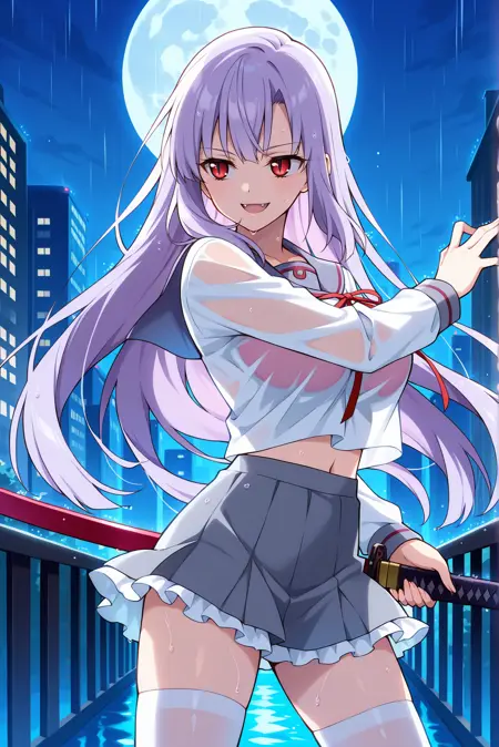外見: 淡い紫の髪、長い髪、赤い目、縦に細長い瞳
