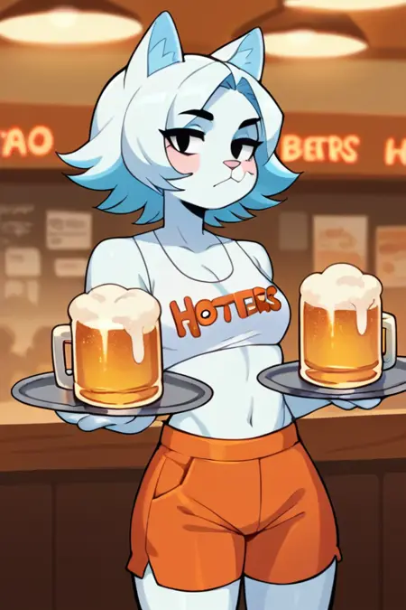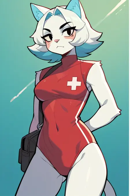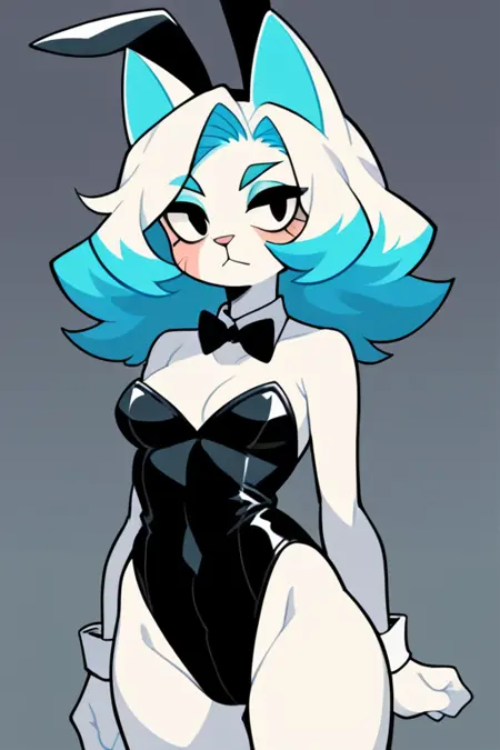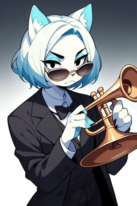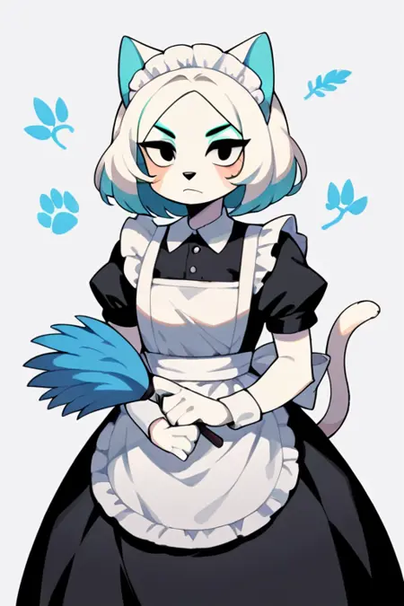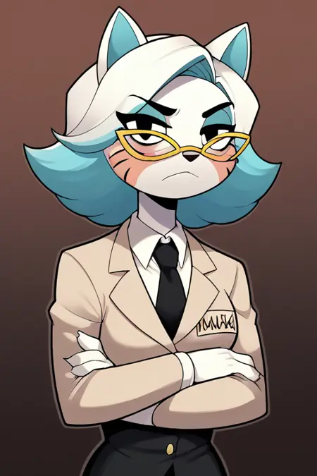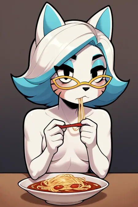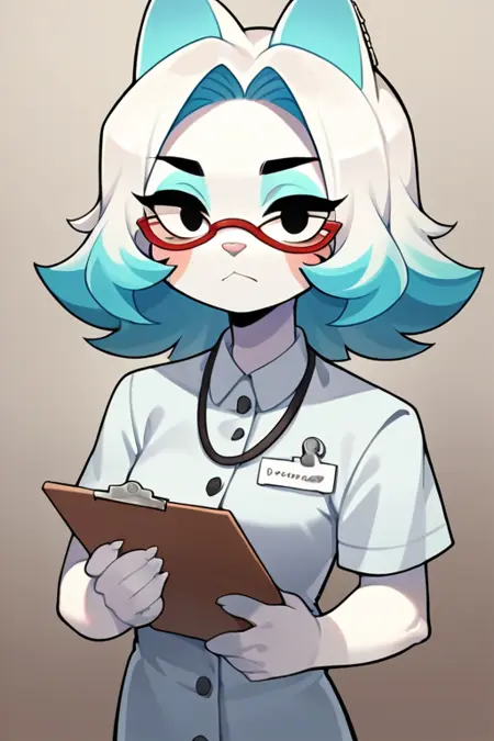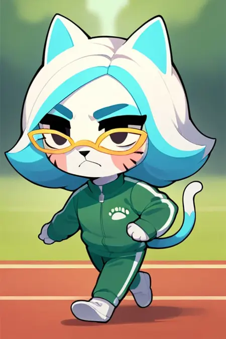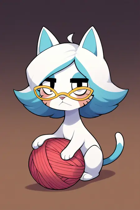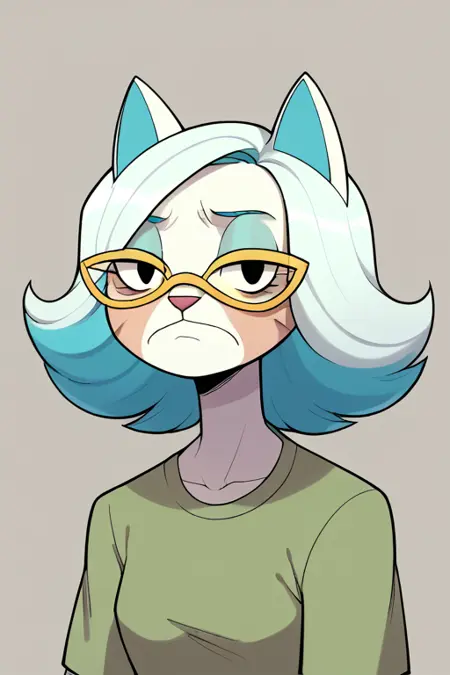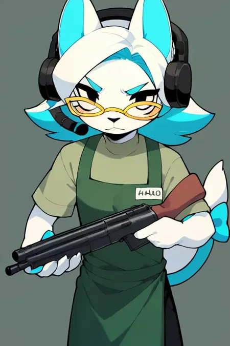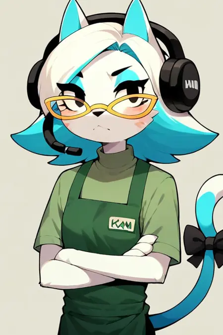 Karen, white fur, white hair, blue hair, tail, green sweater, apron, yellow glasses, headphones, ribbon