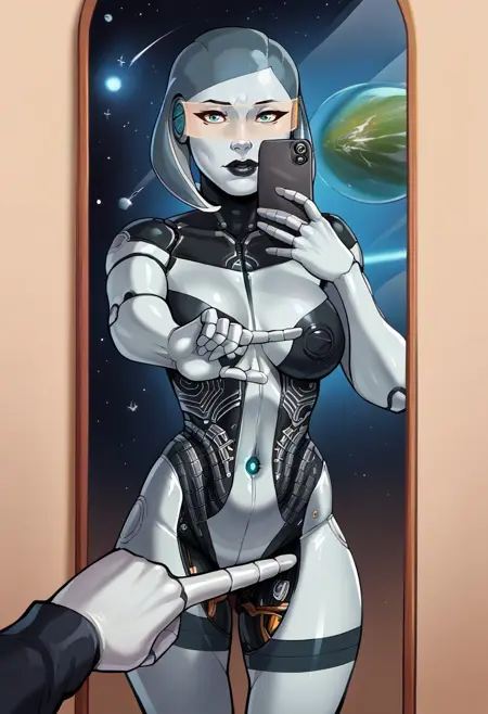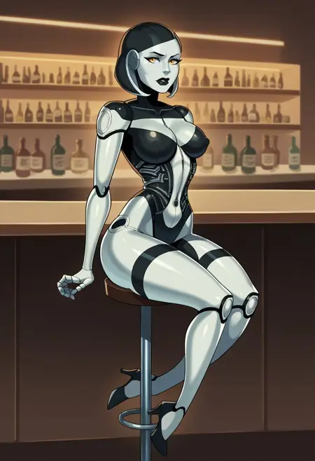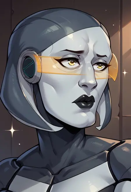 %- 다음 토큰을 추가하면 정확도를 더욱 높일 수 있습니다: 인간형 로봇, 검은 입술, 노란 헤드업 디스플레이, 회색 피부, 단발, 검은 머리