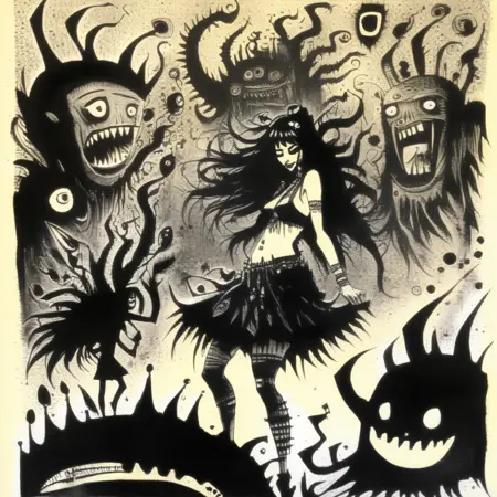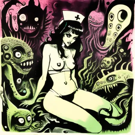 今天又推出一款Corcoc风格系列的LoRA。这是基于我使用传统和数字技法创作的插画训练的另一个模型。风格怪异、常常不可预测,且带有暗黑风格。你可以通过降低权重来获得更柔和的效果。