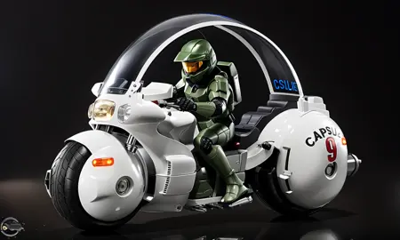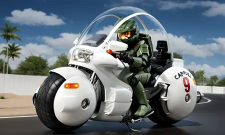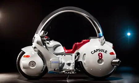 Best way to structure your prompt " large round motorcycle" and You can add " Text "Capsule 9" if you want the decals. You can also add windshield if you want the glass to appear or add it in the negative prompt if you don't want bubble glass.