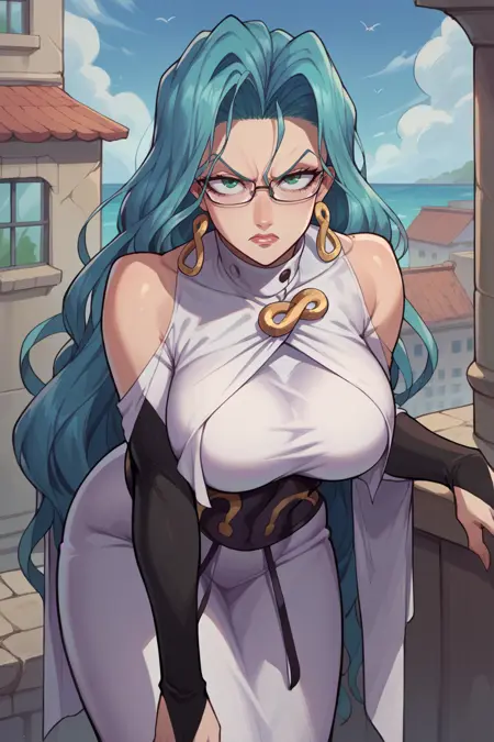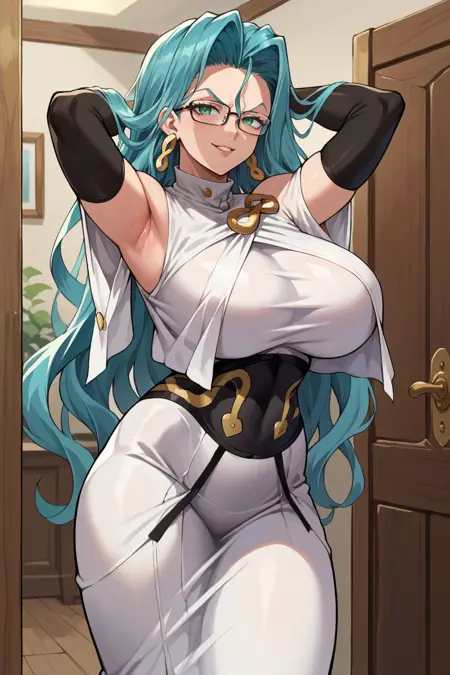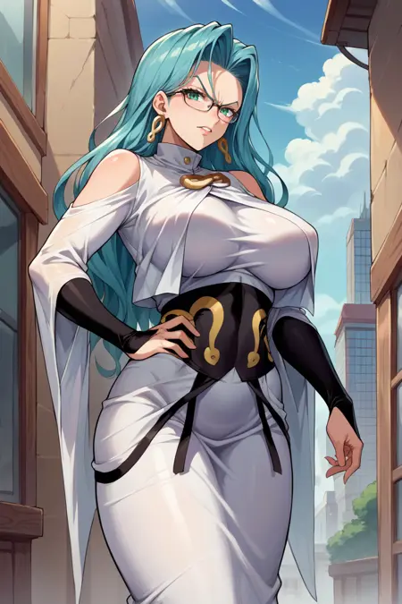 - Add "glasses, earrings, white dress, brooch, underbust, long dress, bridal gauntlets" for her typical look.