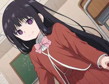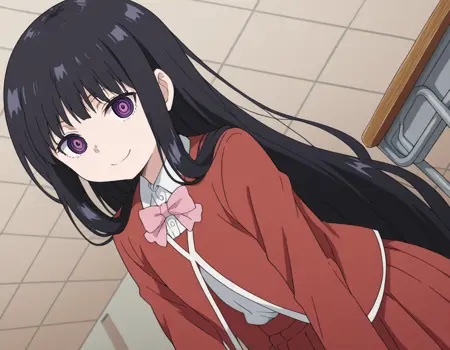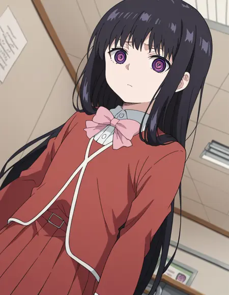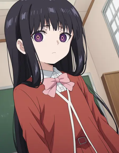 oto adashino, long hair, bangs, black hair, very long hair, purple eyes, ringed eyes,
