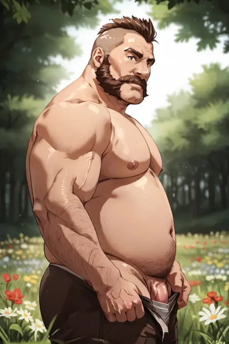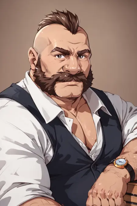 tags:barrel_\(ld\), chubby male, brown hair, mohawk, hulihee beard