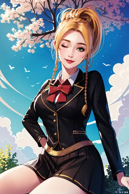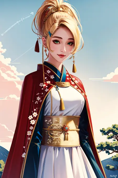 1girl, solo, long hair, breasts, blonde hair, hair ornament, medium breasts, green eyes