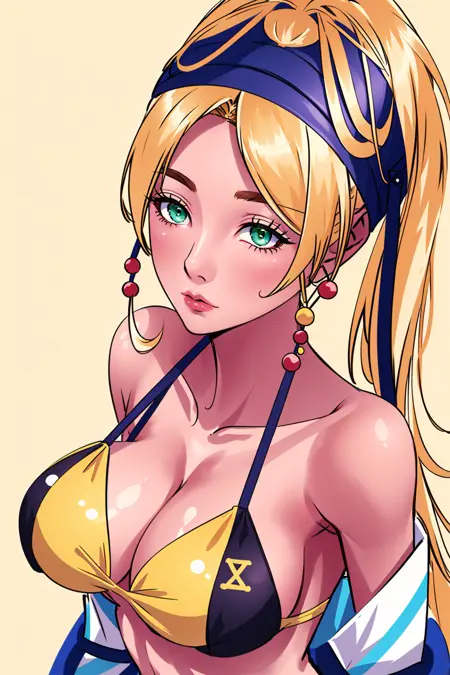 RikkuX2, blue headband, yellow bikini, scarf, skirt, navel, detached sleeves, bikini top onlyOther Outfits: