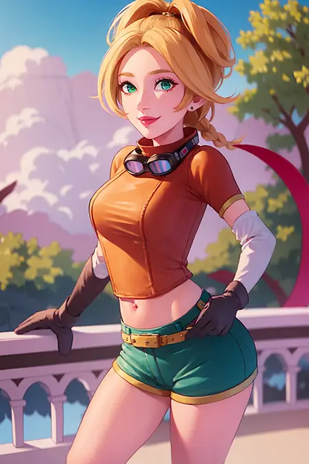 RikkuX, x hair ornament, goggles around neck, fingerless gloves, midriff, navel, belt, bootsX2Outfit: