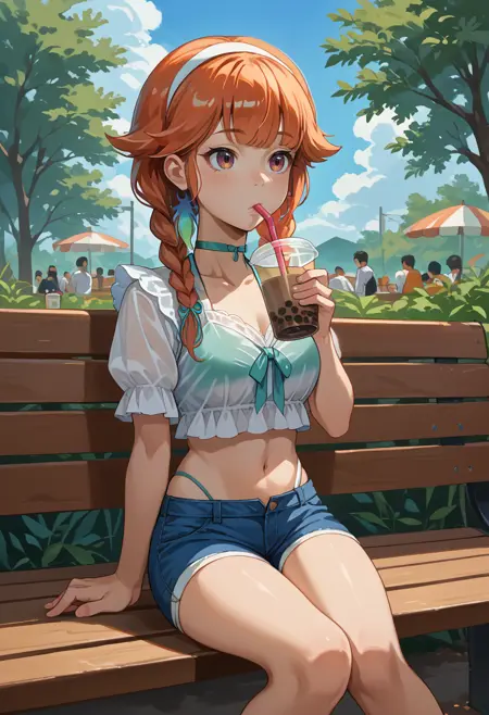 KiaraCasual, twin braids, hair flaps, white hairband, feather earrings, aqua choker, white blouse, see-through, short sleeves, bikini under clothes, midriff, denim shorts
