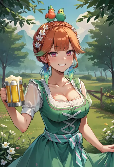 KiaraDirndl, crown braid, head wreath, bird on head, feather earrings, white frilled choker, dirndl, green dress, collarbone, bodice, see-through short sleeves, cleavage, aqua waist apron