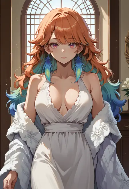 TakanashiKiara, long hair, gradient hair, hair between eyes, feather earrings