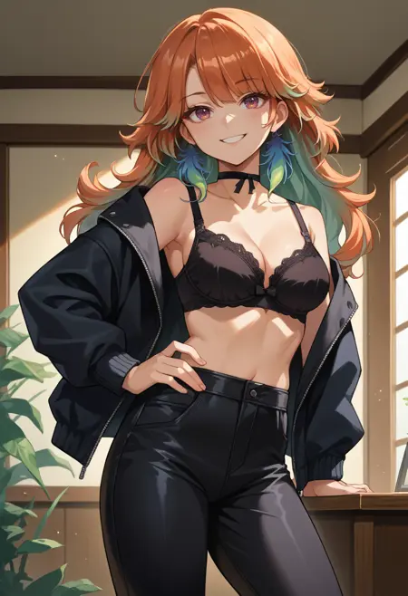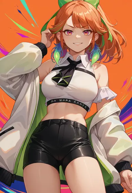 KiaraPhoenix, medium hair, ponytail, green hair bow, feather earrings, black ribbon, headphones around neck, collared shirt, white shirt, crop top, sleeveless, black shorts, short shorts, white jacket, off shoulder