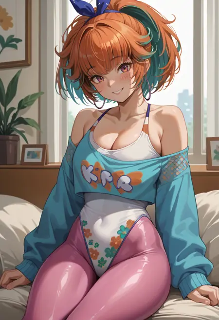 KiaraFeverNight, medium hair, high ponytail, blue bow hairband, hoop earrings, aqua sweater, off-shoulder sweater, clothes writing, white leotard, floral print, cleavage, highleg, pink pantyhose, white legwarmers