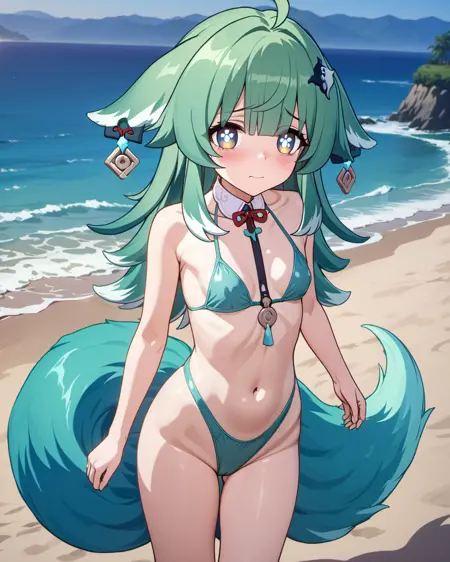 推荐标签包括:huohuo\(honkai star rail\),1 girl,solo,符号形瞳孔,小胸,尾巴,帽子,绿发,刘海,发饰。